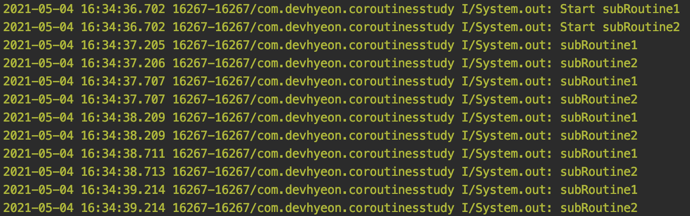 subRoutine1, 2, 3 은 모두 코루틴으로 실행을 시켰습니다.