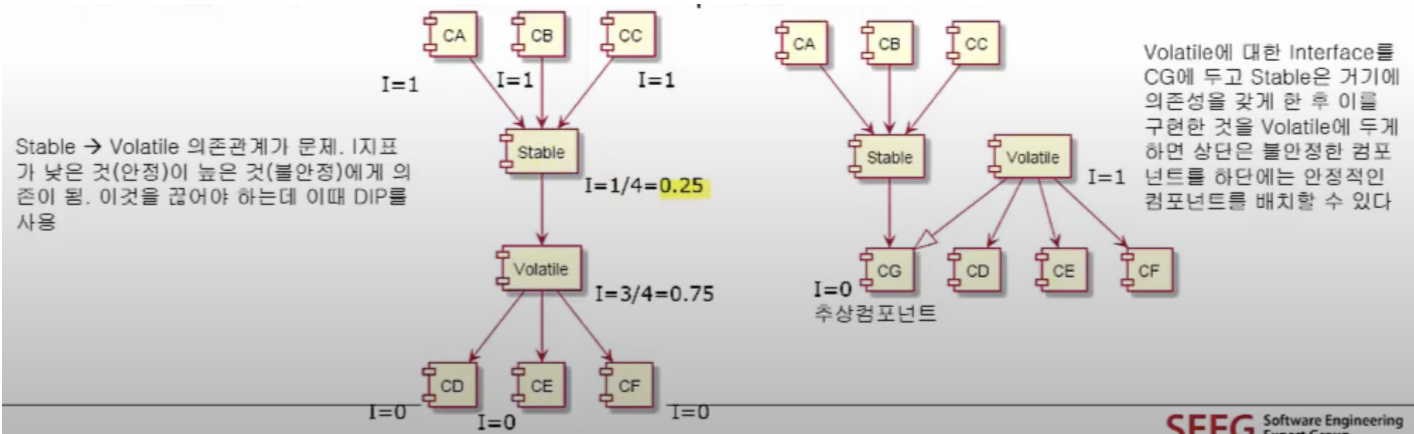 - I(불안정성) = Fan-out / (Fan-in + Fan-out)