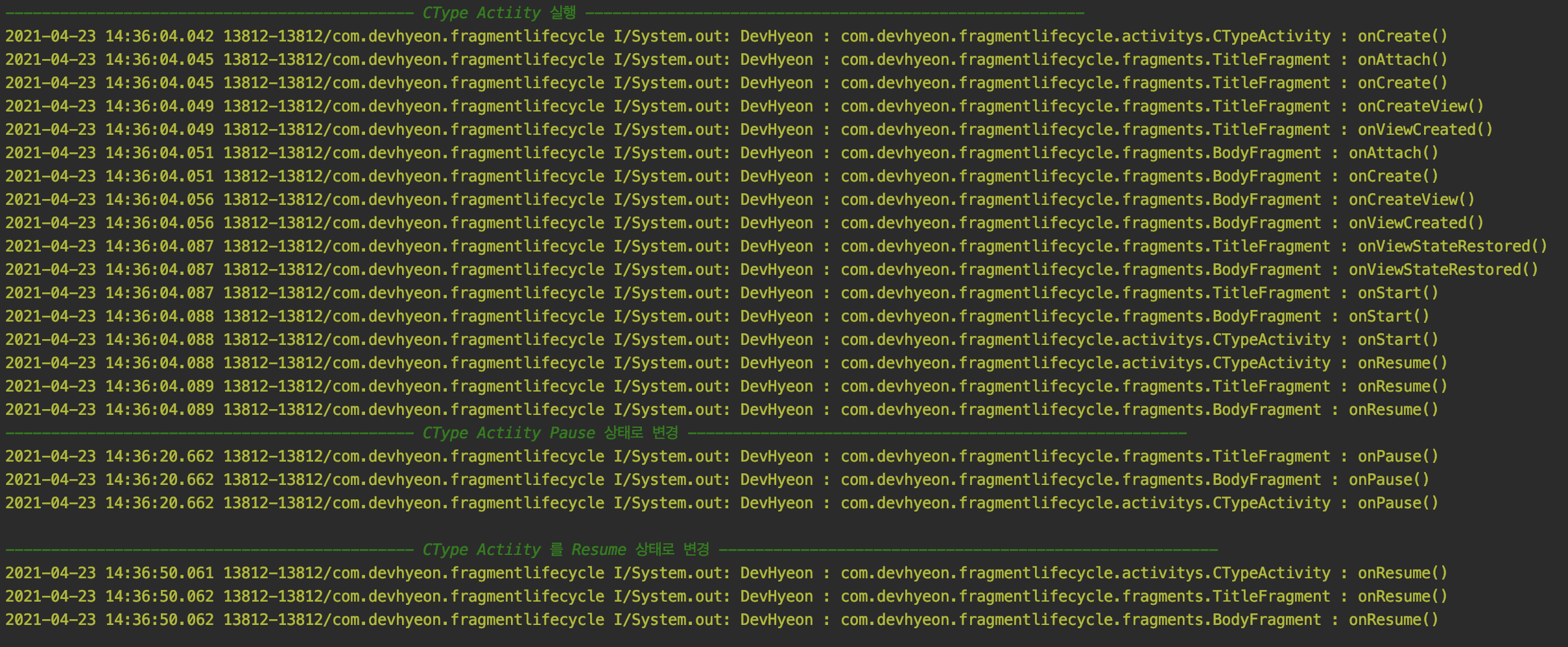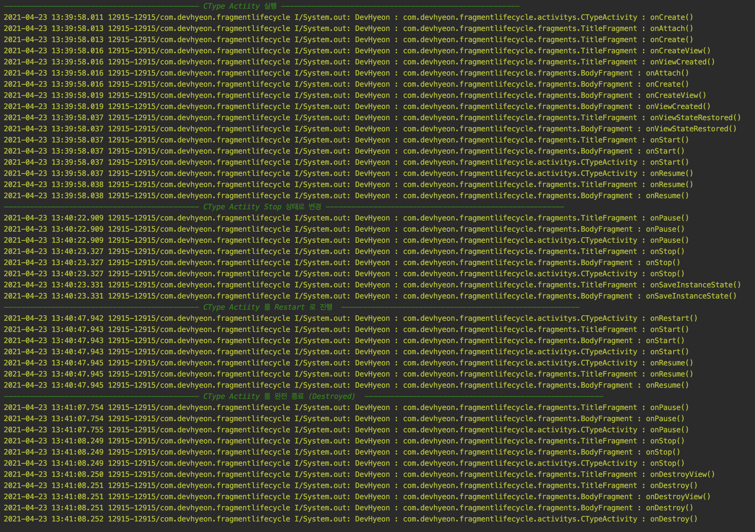 c. Actvity 에서 생성된 Fragment 가 Activity 생명주기에 따라 어떻게 변하는가?