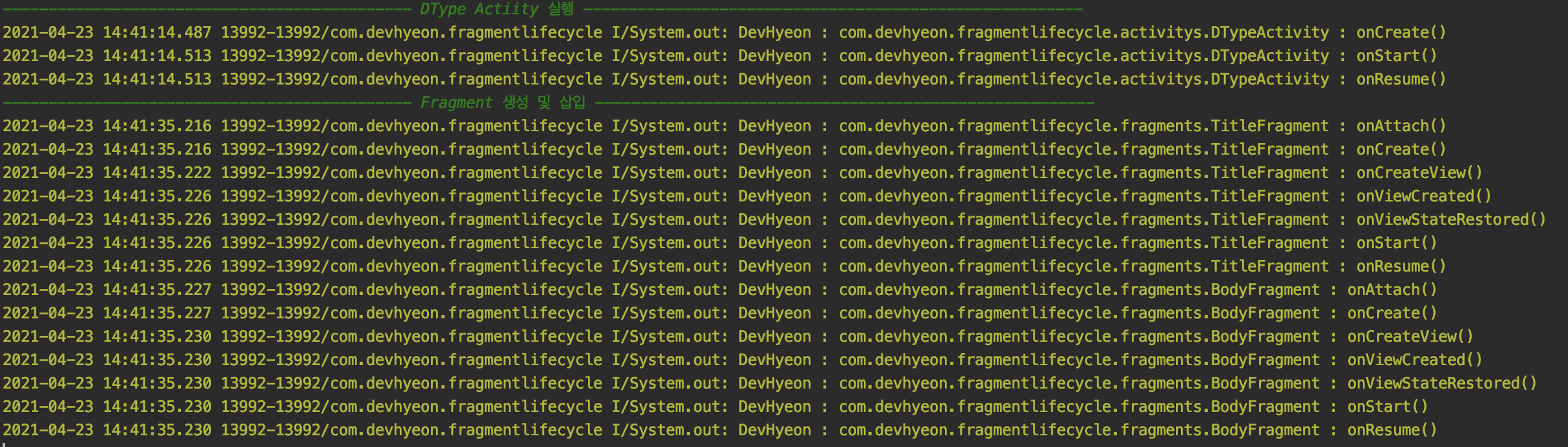Fragment LifeCycle 은 직접 실행시켜보고 로그를 확인해보는것이 좀더 빠른 이해를 도울 수 있습니다.